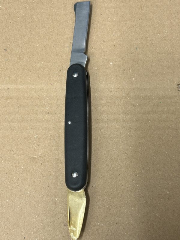 Gärtnermesser mit spezieller Messing Okulationsnase zum Anheben der Rindenflächen, Messer beidseitig geschliffen (siehe Bilder, Vorder- und Rückseite)